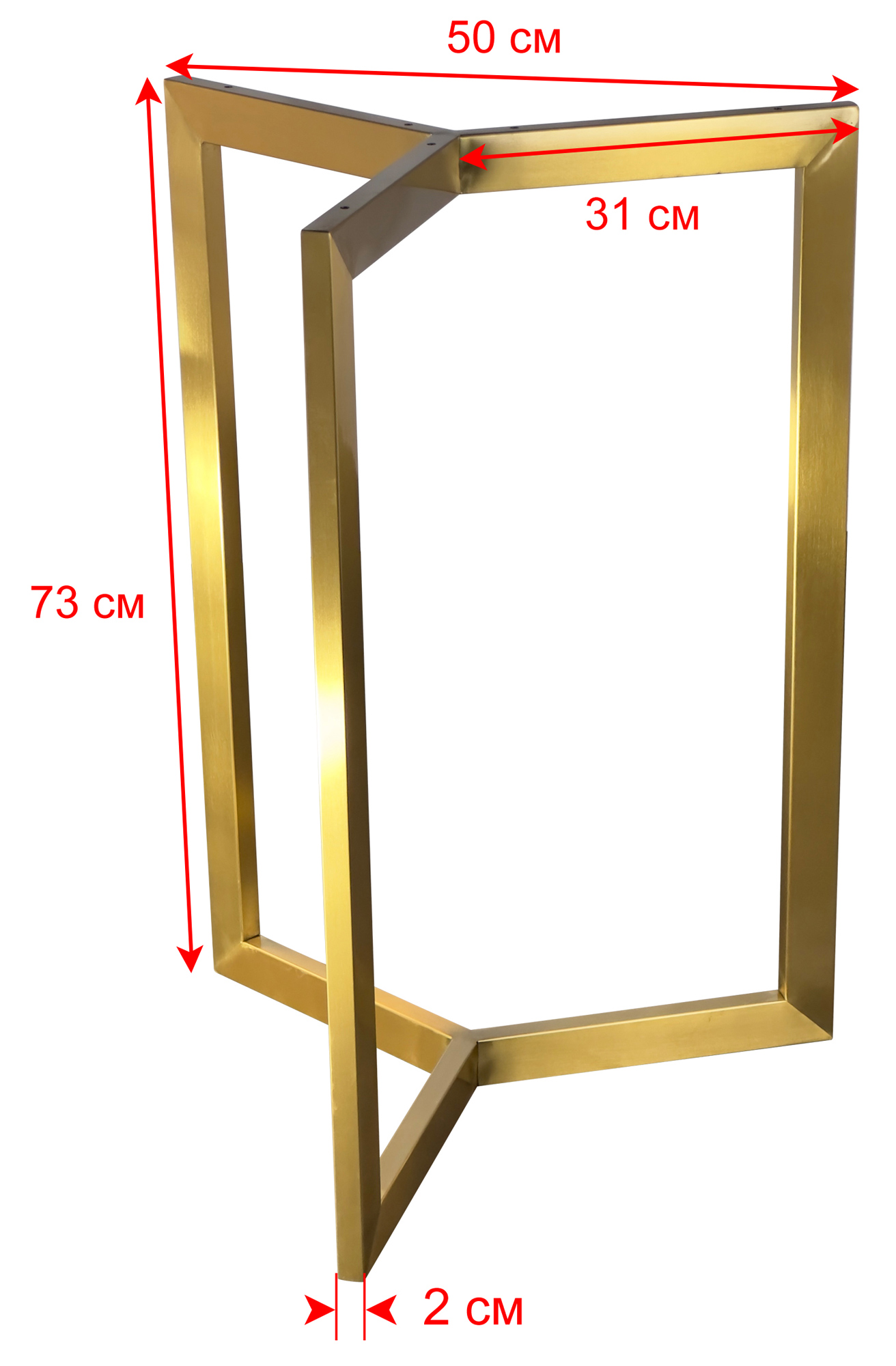 Нестандартное треугольное подстолье с золотым покрытием (52 см сторона) обеспечивает устойчивость столешницам Ø60 см. Уникальный дизайн и премиальное покрытие делают его заметным элементом интерьера.